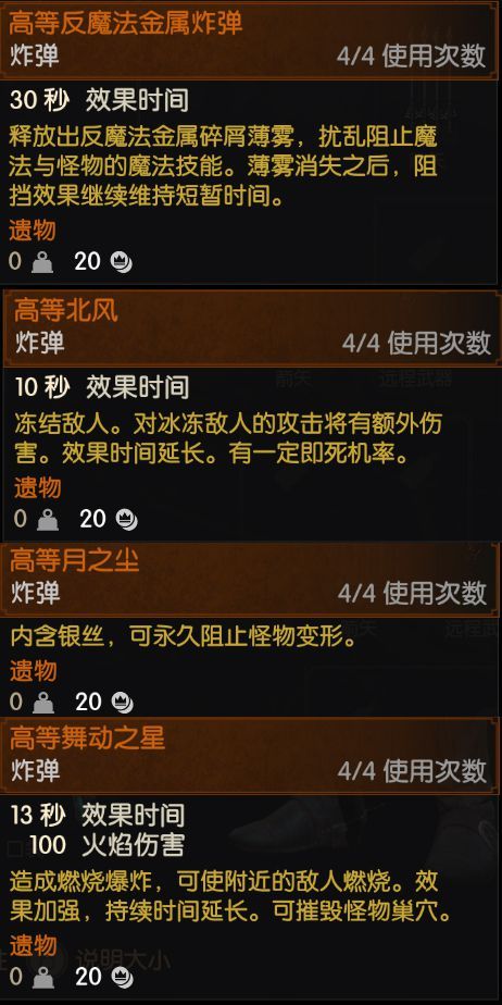 真正有用处的炸弹也就下面这几个,首选月之尘,对于妖灵类敌人有奇效,其次是舞动之星,不是因为伤害多高,是因为可以炸怪物窝,其实能炸怪物窝的还有别的,这里只是用来做个代表。