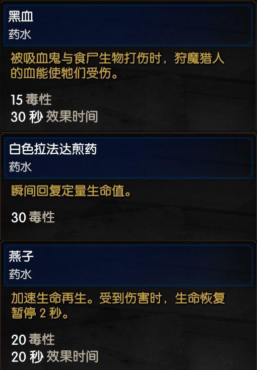 白色拉法达是前期保命神药,黑血打到陶森特才能发挥真正的效果,吃燕子的时候最好不要战斗。