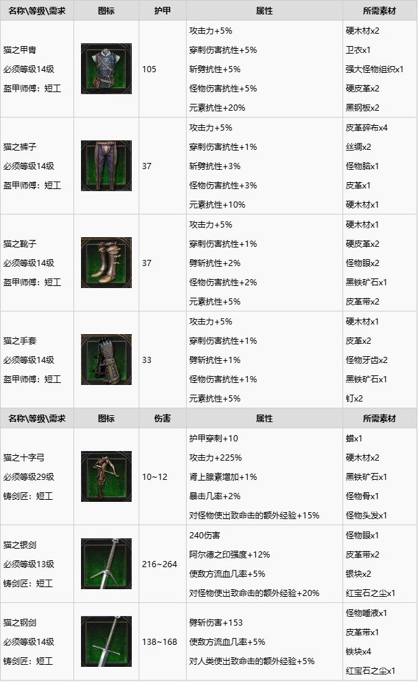 猫学派套装全部是轻甲,虽然比不上重甲的防御力但是可以加快活力的回复并且附带暴击几率的加成,利用药物与技能可以把暴击几率和伤害提高到惊人地步,但同时也因为防御力比较低,需要较为灵活的操作才能驾驭。