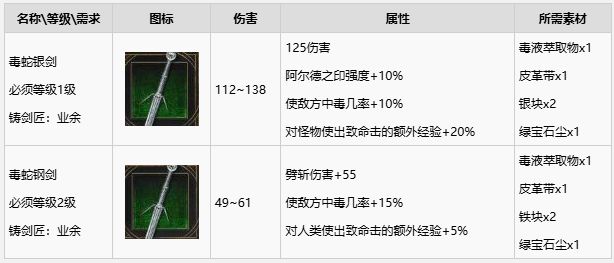 毒蛇剑自带毒属性,虽然攻击力不高但是让敌人中毒之后的话还是很有效果的,是一个非常不错的前期过度武器