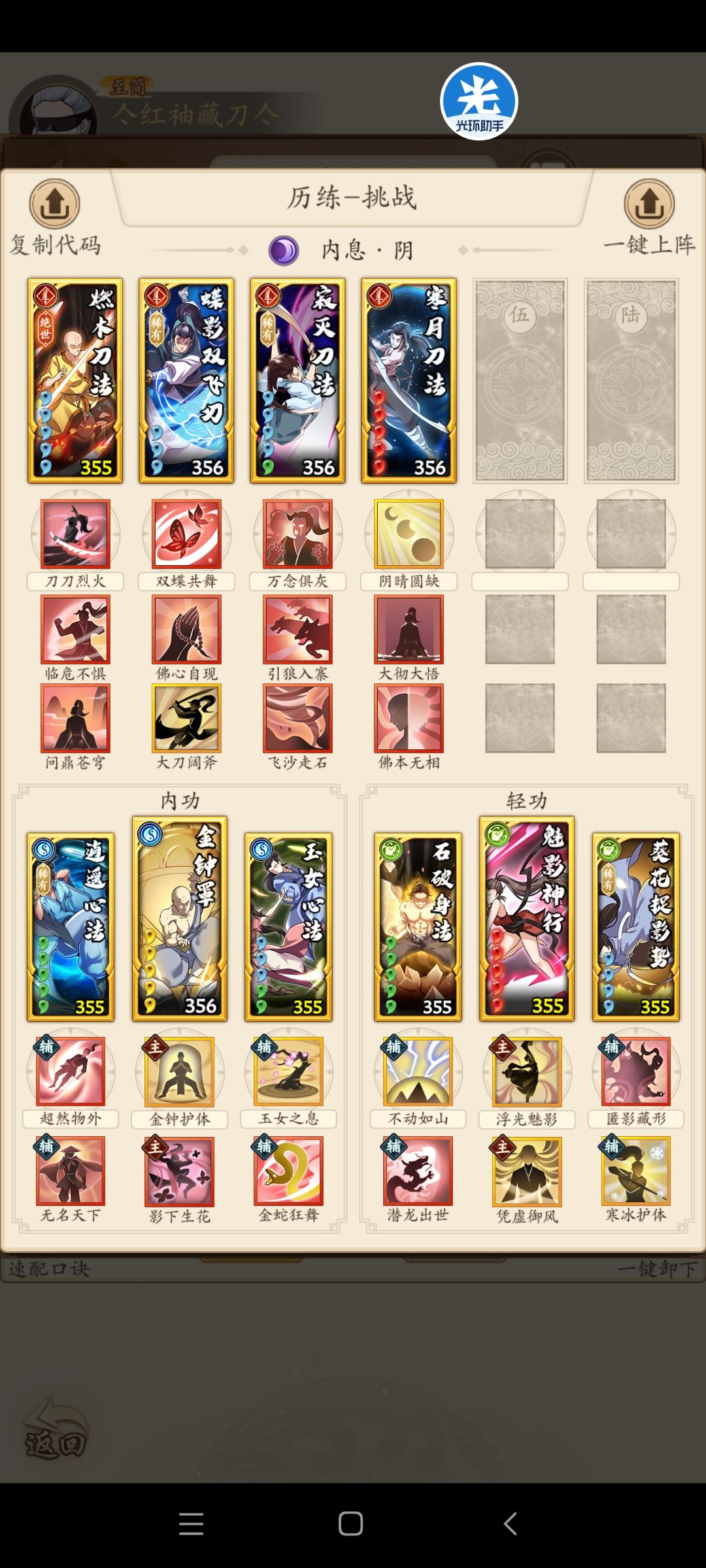 这里给大家提供的是前四手的,后面两手大家可以再补伤害和回复续航来做一个选择。补伤害的话可以上“秀春刀法+修罗八刀”;如果需要做一个回复续航的话,可以上“玉慈九剑+归西剑法”。