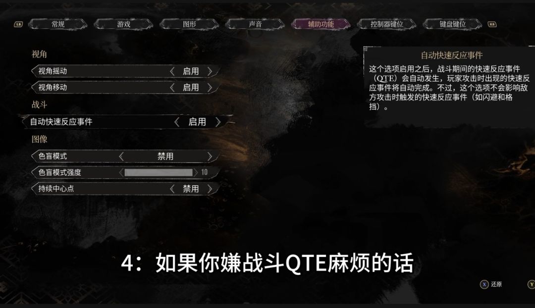 四、如果你嫌战斗QTE麻烦的话,可以把辅助功能里自动快速反应事件启用
