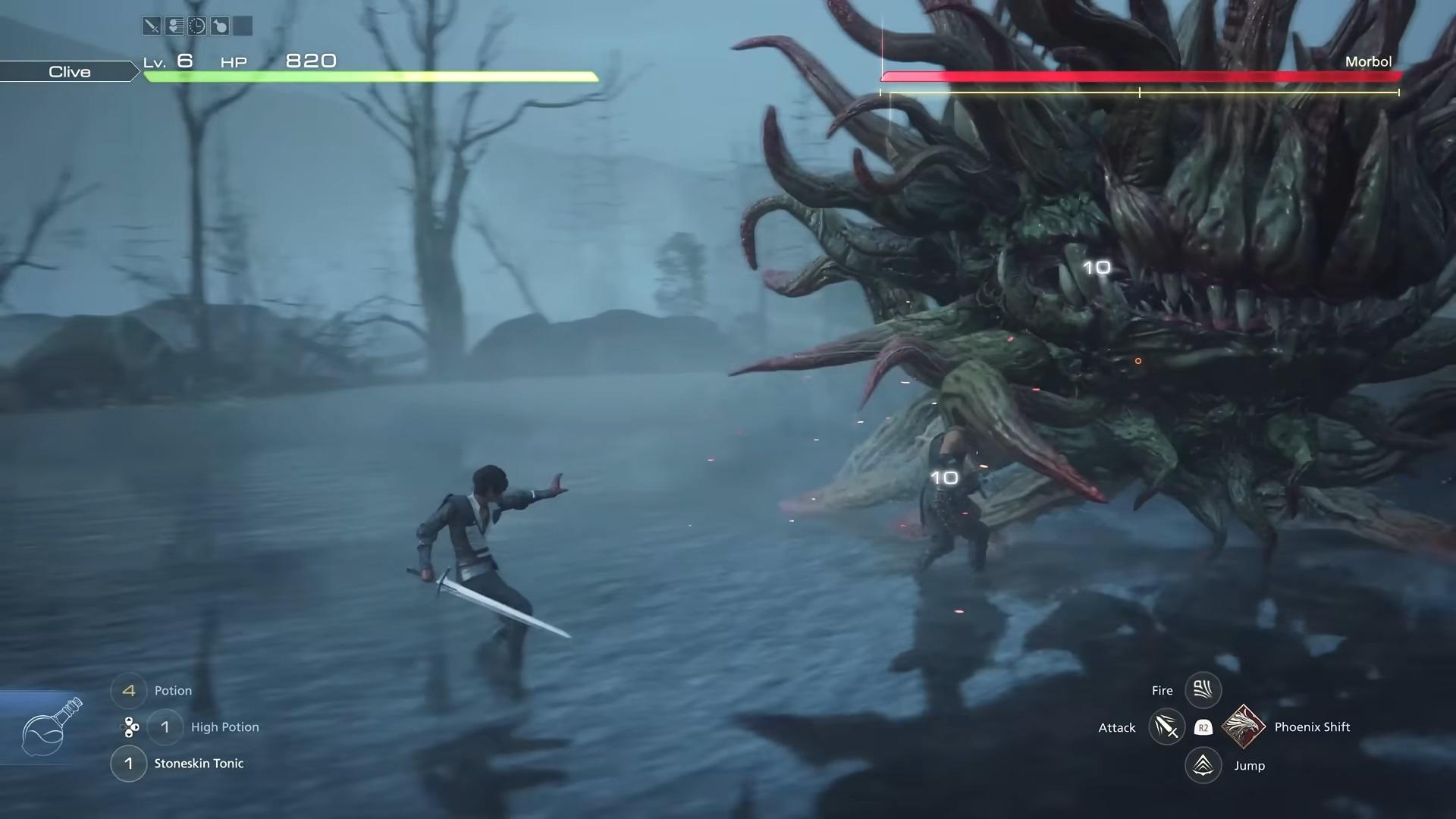 在第一段较长的可操作环节中,你将扮演少年克莱夫穿越一片泥泞的沼泽地,里面到处都是长相极为标准的哥布林。在这一部分的最后,你将在一场很有趣的战斗中迎击瓦利斯泽亚版「最终幻想」经典敌人「魔界花」——一个被黏液覆盖,长着一身触须和两排尖牙还有着严重口臭的怪物。这是《最终幻想 16》第一次真正完整呈现它的奇幻战斗,因为标志性的炫酷攻击和闪避动作都已正式解锁。
