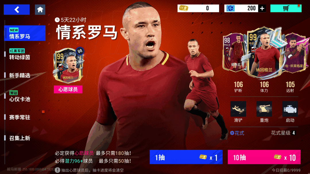 【情系罗马】卡池将于5月5日11时至5月12日11时开启!每次招募都有概率获得99潜力巅峰纳因格兰、98潜力巅峰佩莱格里尼、98潜力精选曼奇尼等球员!