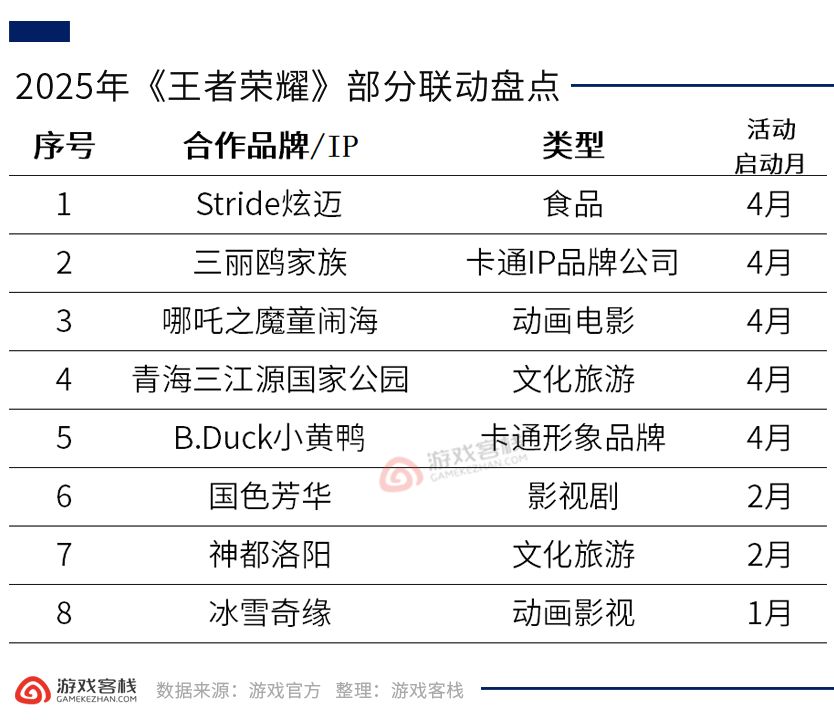 2025年《王者荣耀》已官宣8次与《冰雪奇缘》《国色芳华》《哪吒之魔童闹海》及三丽鸥家族等知名IP的联动合作,横跨食品、卡通、影视、文旅等领域,4月集中官宣5次,2月官宣2次。这对其长线运营意义重大,通过与多元IP联动,能借助各领域粉丝基础吸引新用户、留住老用户,丰富游戏内容与玩法,拓展品牌影响力。