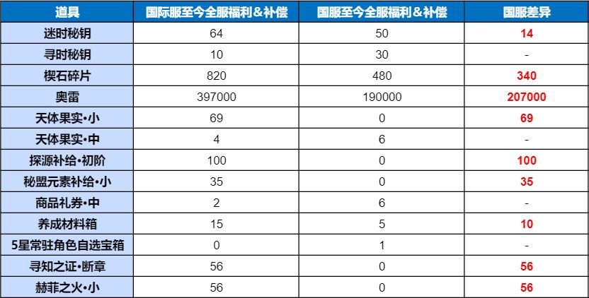 截止5月5日,我们完成了国服与国际服发放的福利和补偿内容的整理,我们将补齐国际服与国服所有的差异化补偿内容,以确保预见者所获取的补偿内容是保持一致的。