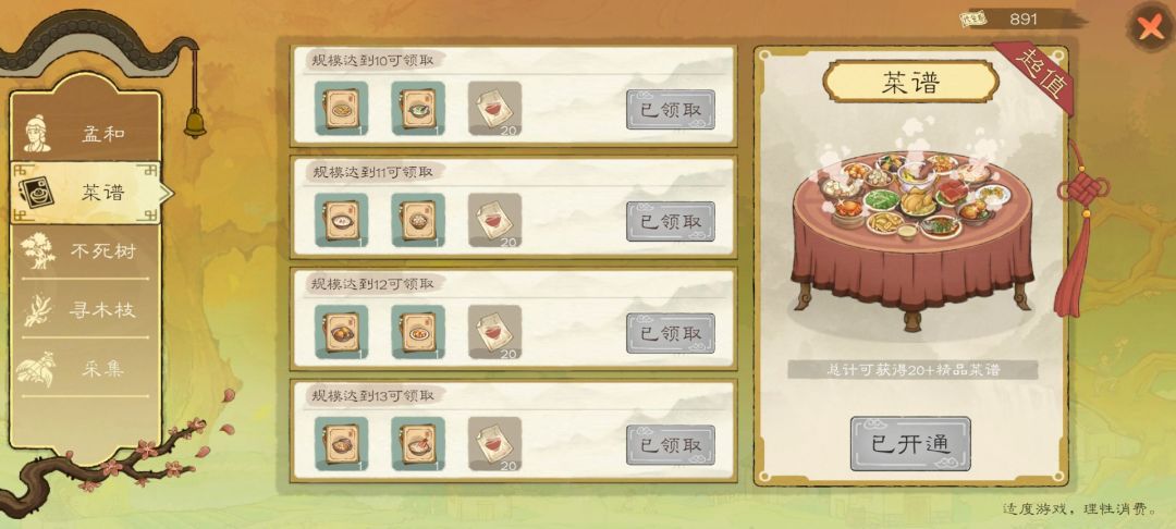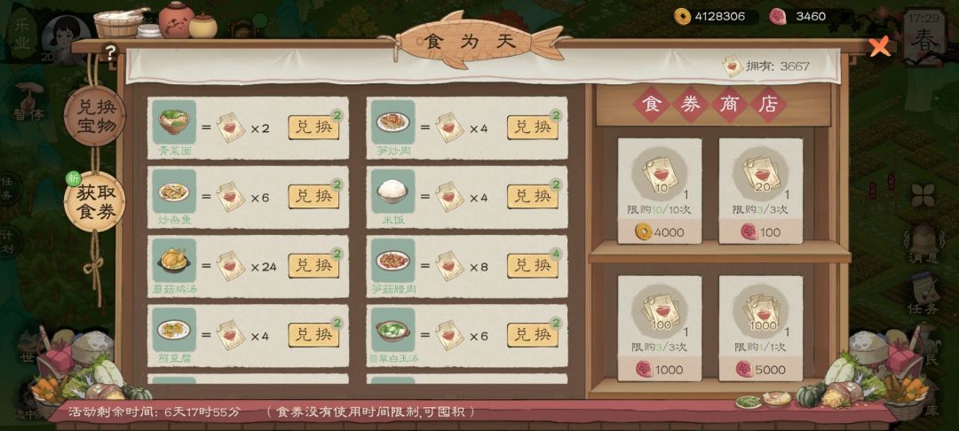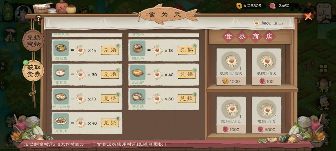 基金食谱给的精品食谱:野菜汤,青菜面,笋炒肉,白米饭,荪菇腊肉,炒杂鱼,煎豆腐,翡翠白玉汤,蛋炒饭,豆浆,炒白菜,白菜炖肉翡翠肉炒饭,酸菜炒笋,碧涧羹,三宝粥,酱萝卜,狮子头,酱烧地芝,南瓜煲,南瓜海鲜粥各食物可兑换食卷