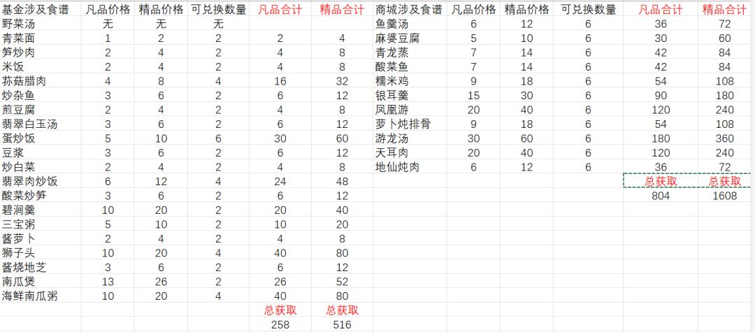 神秘商人售卖的精品食谱:兽肉汤,地仙炖肉,蘑菇鸡汤,鱼羹汤,清蒸鱼,青龙蒸麻婆豆腐,酸菜鱼,东坡肉,糯米鸡,清蒸螃蟹,萝卜鲫鱼汤萝卜肉卷,萝卜炖排骨,银耳羹,冬瓜炖肉,凤凰游,游龙汤,天耳肉