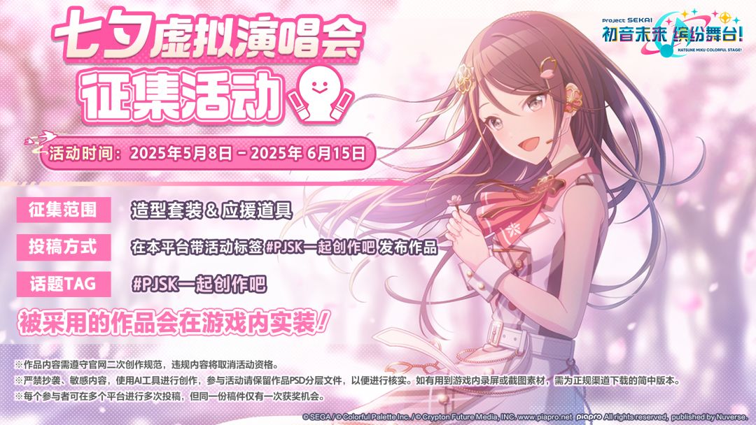 关注官方账号,并带活动TAG #pjsk一起创作吧 将造型套装和应援道具公开发布于活动平台,即视为投稿成功。
