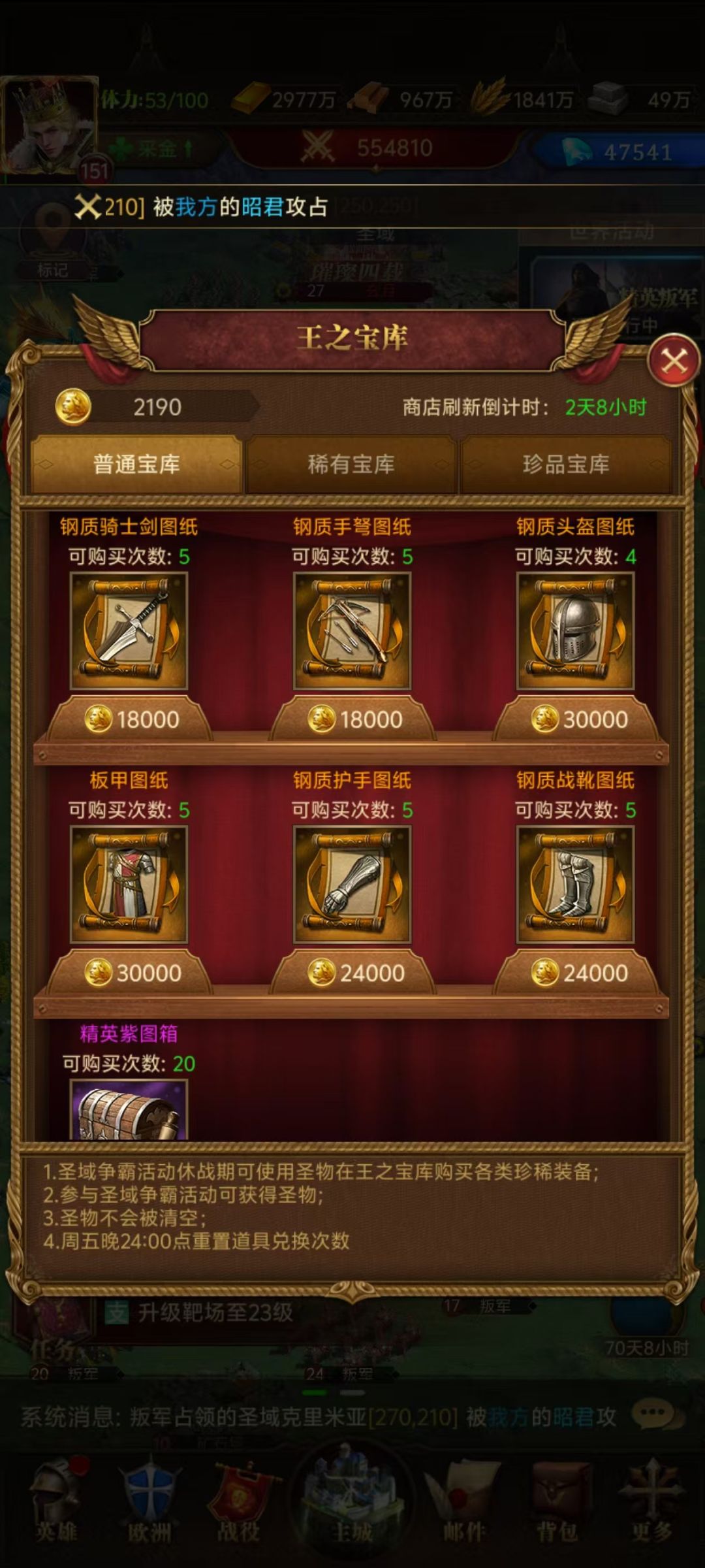 说到蓝装,那可是能陪你走过国家战区阶段的好装备,氪金大佬们当然可以忽略不计。七日豪礼第三天,你会收到一把蓝装长剑;七日充值活动,充到500和1000档位,两件蓝装就到手了;进入国家战区后,打打大叛军(11级以上的)有机会拿到绿色图纸;攻打营地、据点和城市,都有机会获得蓝色图纸,尤其是攻打城市,蓝色图纸是必得的;另外随着贵族等级提高,购相应的礼包可获得蓝装,请按需购买。这些图纸同样可以在铁匠铺里变成你的强力装备。