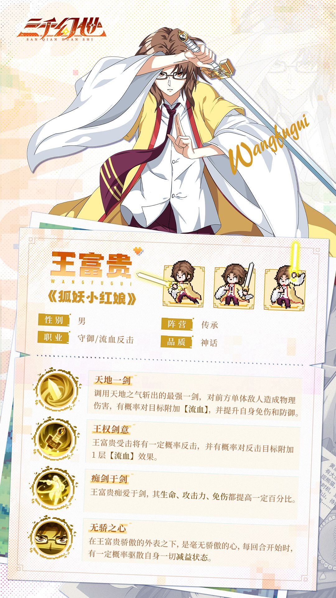 王富贵痴爱于剑,其生命、攻击力、免伤都提高一定百分比。