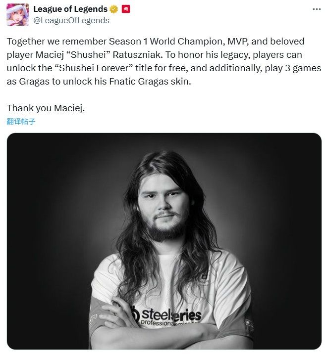 LOL官方宣布,将推出纪念活动来纪念因病去世的S1冠军选手Shushei。