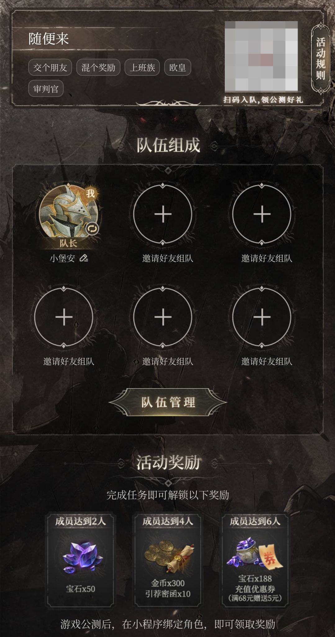 拉上好友一起预先组队,达到一定人数后即可解锁对应的地堡4公测奖励!公测后还将开启一系列小队任务,给堡主们送出更多福利!