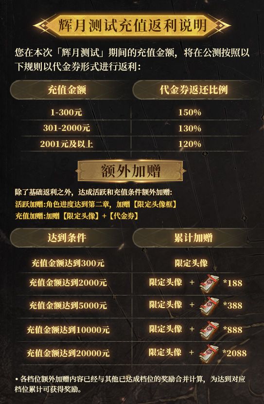 6、「辉月测试」充值将返利至公测正式服的具体规则?