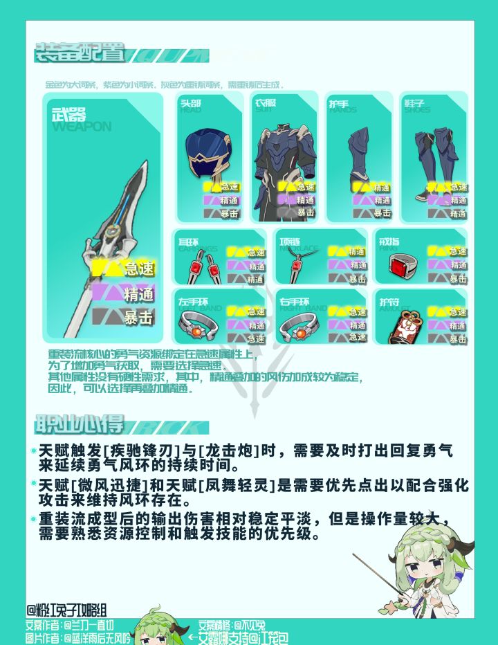 正常情况下重装流应该尽量将天赋中所有涉及勇气回复和锐利上限的部分全部点出,需要注意的是疾驰锋刃和龙击炮触发后也会回复勇气。副属性在急速叠够并且在天赋齐全的情况下只要不是脸黑到中大奖了——出现疾驰锋刃和龙击炮几乎不触发的情况,基本可以维持住勇气风环。除此之外其他的加伤类天赋由于数值目前较难计算,大家可以自行研究,在此不再深入展开讲解。