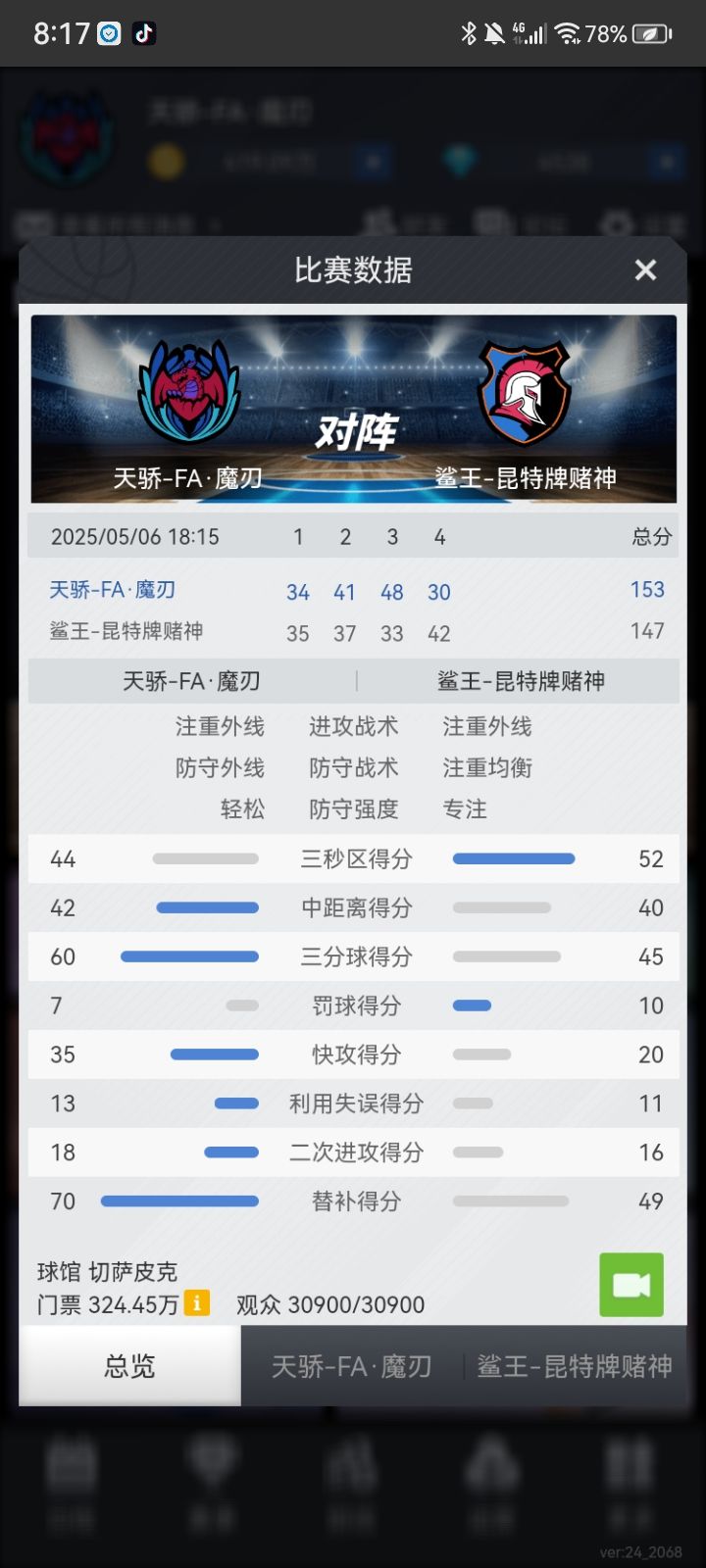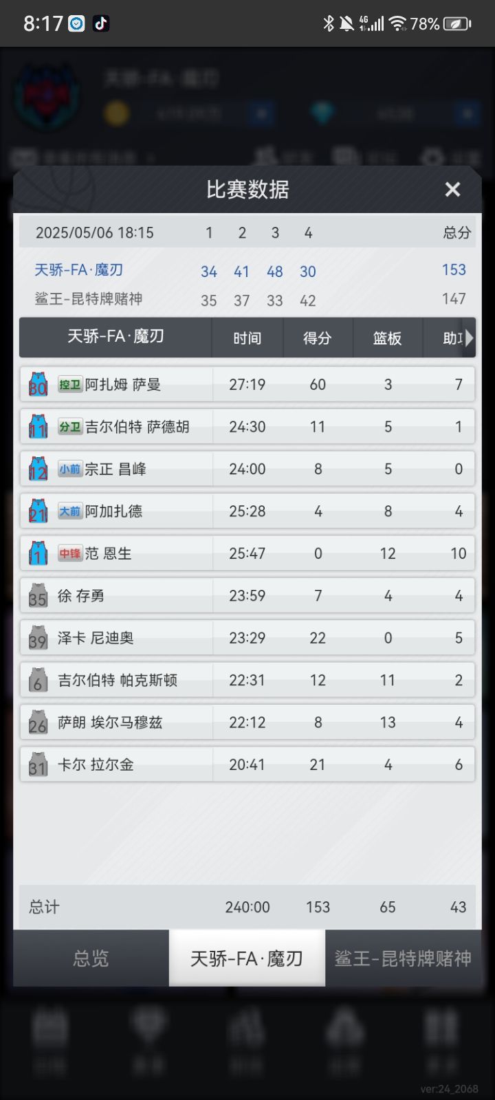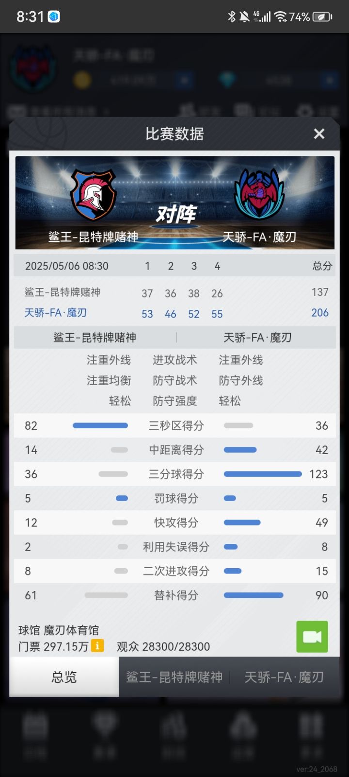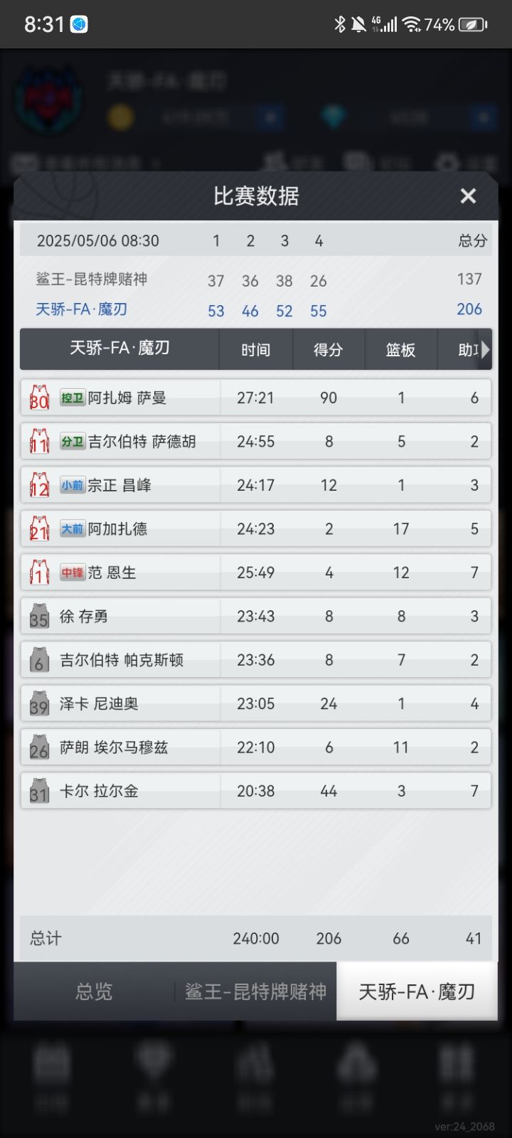 “计划有变,准备夺冠”,魔刃侥幸以两个胜场的差距夺下常规赛第一,半决赛不手软横扫晋级,杀向总决赛,G1,阿扎姆天神下凡,爆砍90+1+6,卡尔拉尔金同样表现出众,替补上场,20分钟拿下44+3+7,总决赛1:0领先,G2,“对手貌似上强度了”“那又如何,我会出手”言罢,阿扎姆气息不再掩饰,60+3+7!在阿扎姆眼中,篮筐如同大海,什么战术?“把球交给30号!”切萨皮克吗?在这里,篮球之神不叫迈克尔乔丹!“MVP!MVP!MVP!”阿扎姆用实力征服了客场球迷,勇夺总冠军!