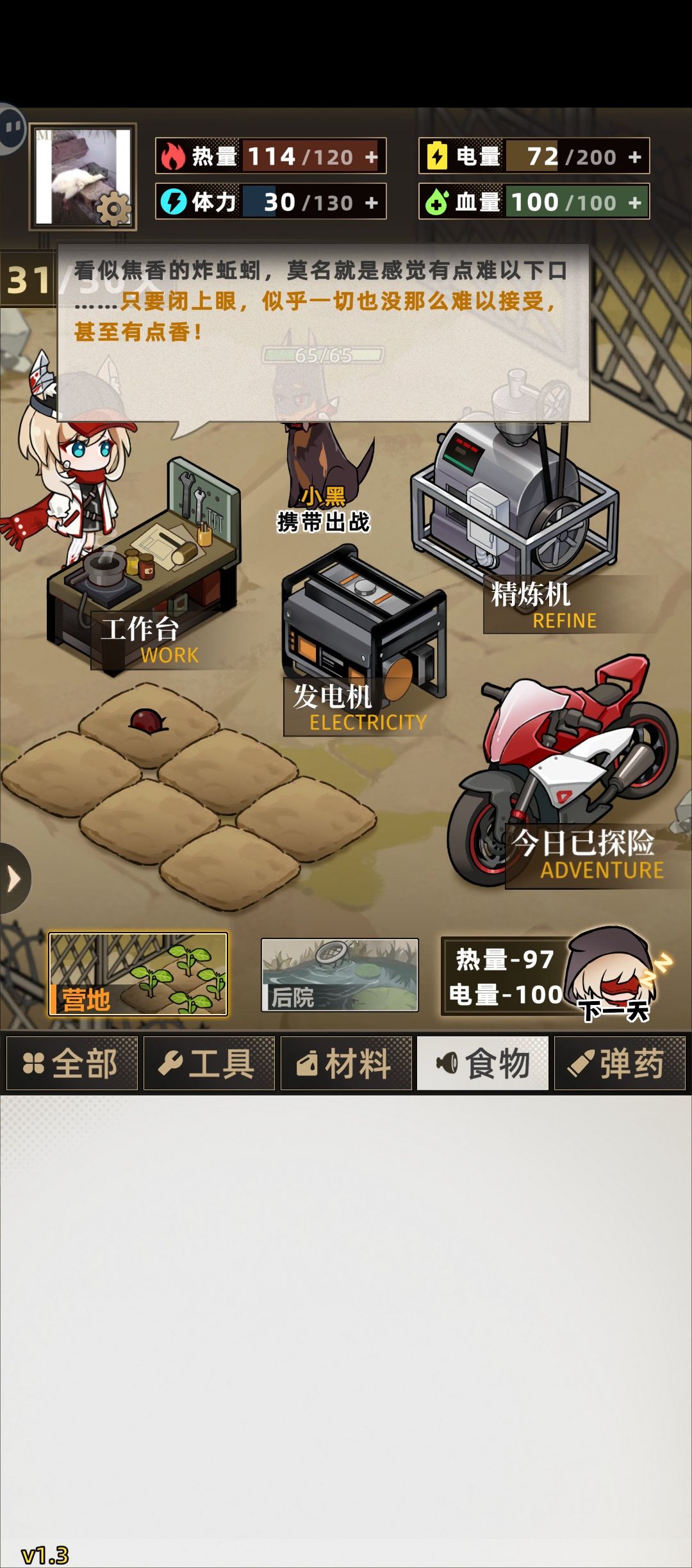 每天捡鱼,刷buff,出去打一圈图,回来砍树或者补电力饥饿。然后就是看脸出物资开锁,资源分配了,建议刷一个体力药剂,以防尸潮没体力翻车。