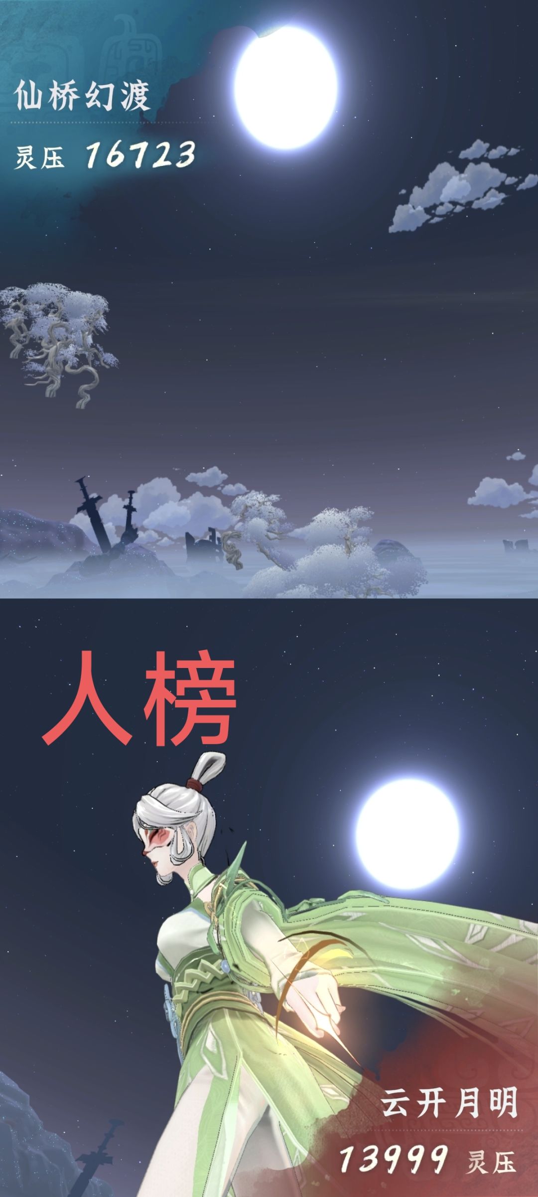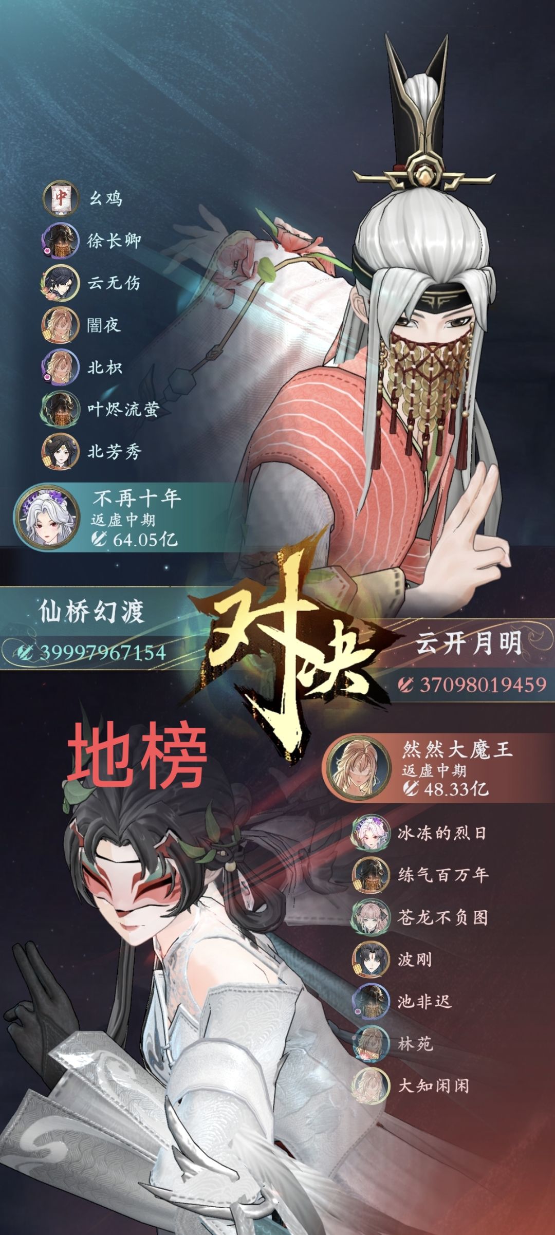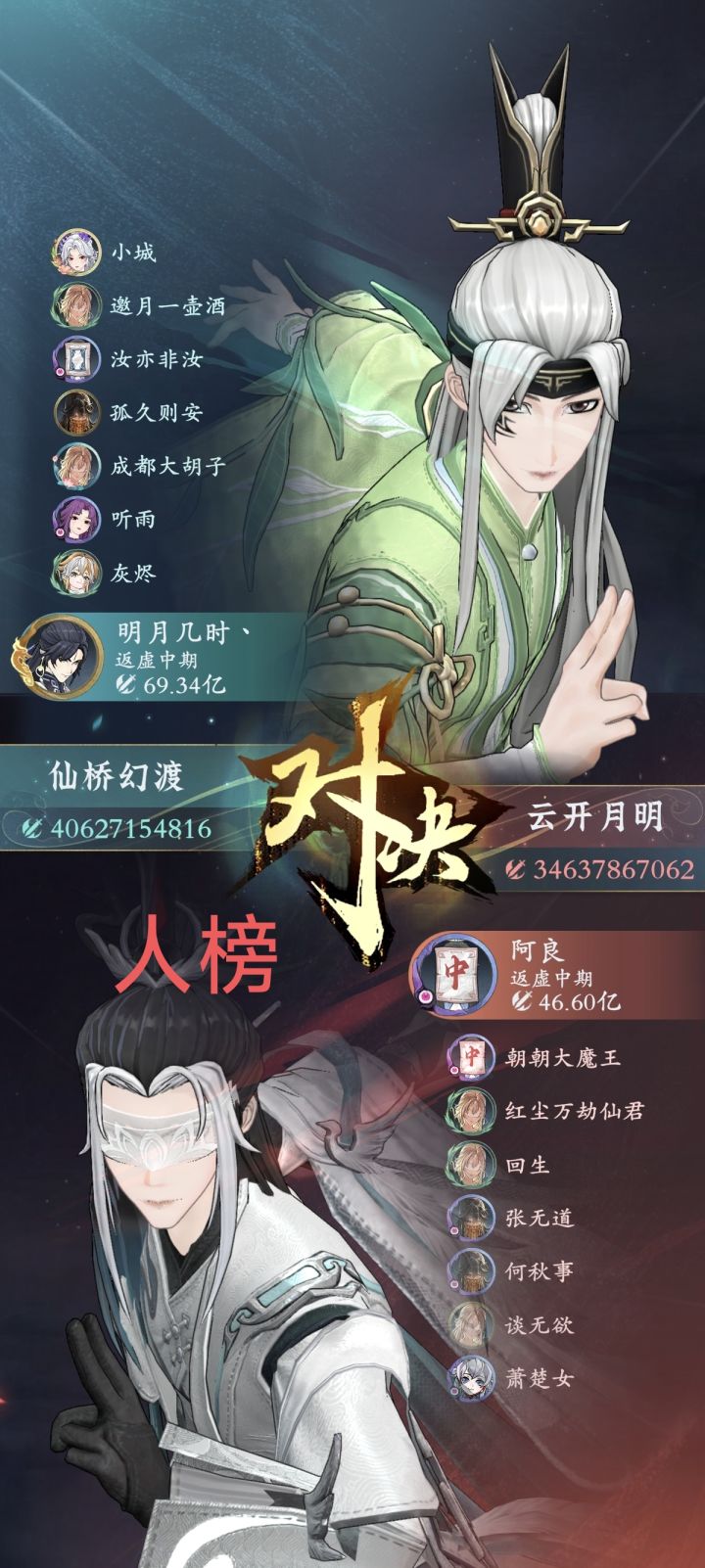 - **仙桥幻渡**:**明月几时(战力69.34亿)**率领**丙组**