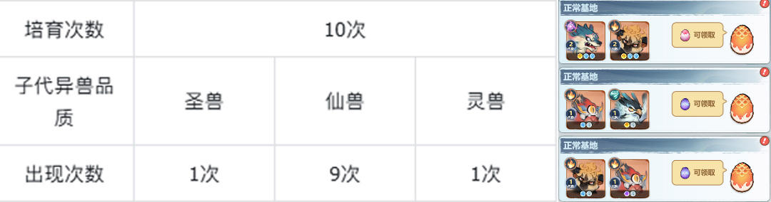 两只异兽需要经过一定的培育时间才可以培育完成,培育时长和异兽的代数有关,代数越高,培育的时间越长。