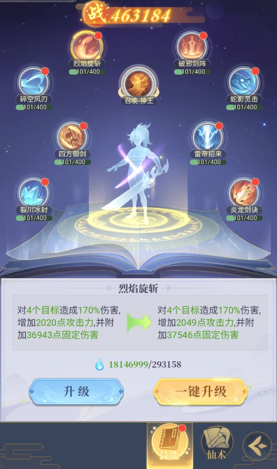 游戏中的不同角色会有不同的技能和效果,比如逍遥剑仙拥有8个基础技能烈焰旋斩、破邪剑阵、碎空风刃、炽热龙卷、四方御剑、雷帝招来、裂川冰封、炎龙剑诀等,不同的技能效果也不一样,例如烈焰旋斩(30级)的效果是:对4个目标照成170%的伤害,增加384点攻击力、并附加5610点固定伤害,不同的技能等级越高,伤害和增益效果也会越强。