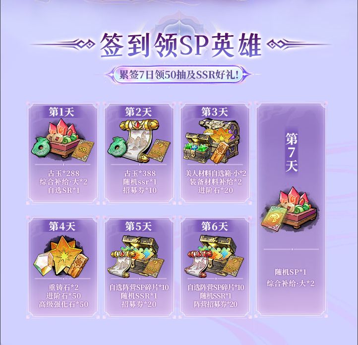 ►第6天签到:自选阵营SP碎片*10、随机SSR*1、阵营招募券*20►第7天签到:随机SP*1,综合补给·大*2