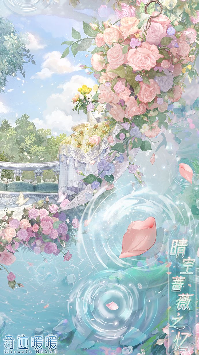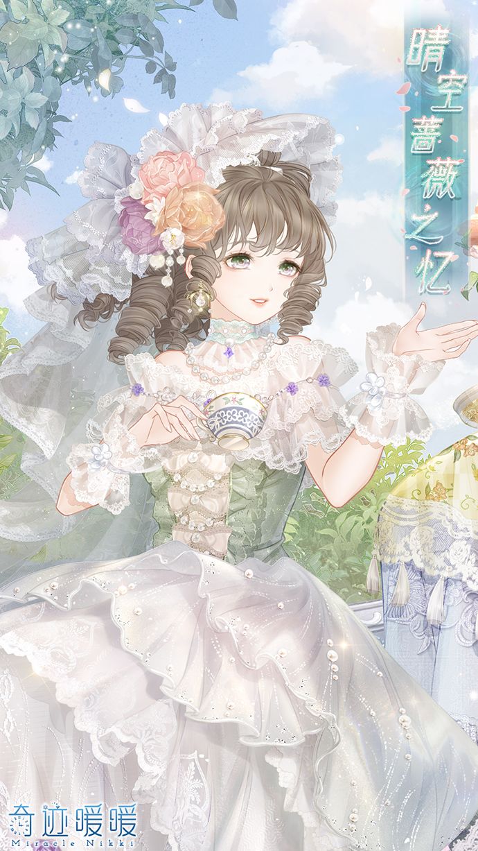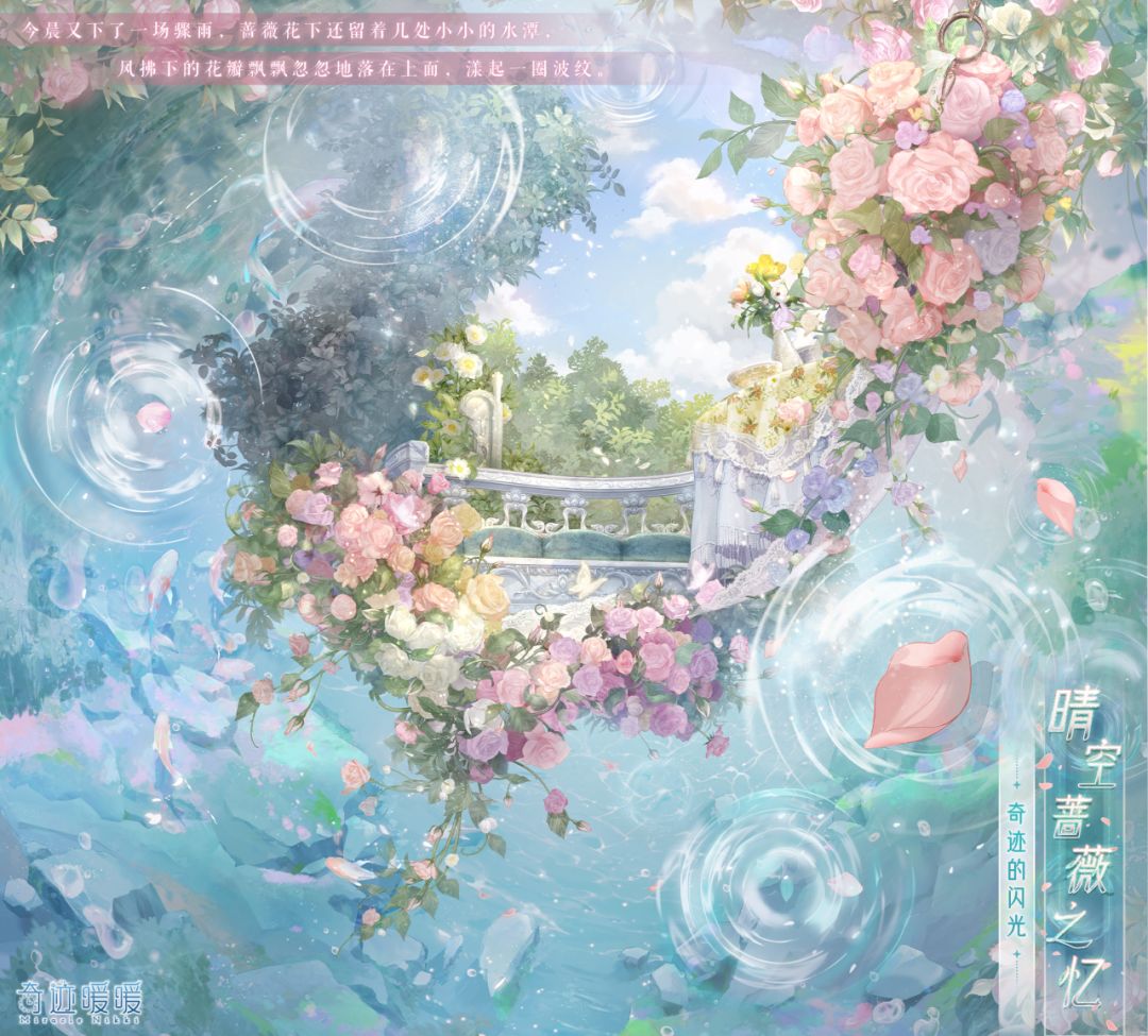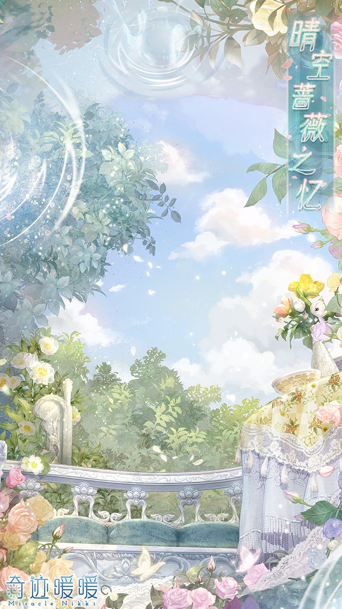 【晴空蔷薇之忆】含正常姿势与特殊姿势,全新妆容“明珠之辉”,动态特姿连衣裙“晴空蔷薇之忆”、“蔷薇故影”,动态摆件“幽木芳园”、“美妙茶会”、“芳馨满庭”、“时与涟漪”,动态特姿发型“风花旋舞”,动态头饰“拂梦流云”、“繁花相颂”。