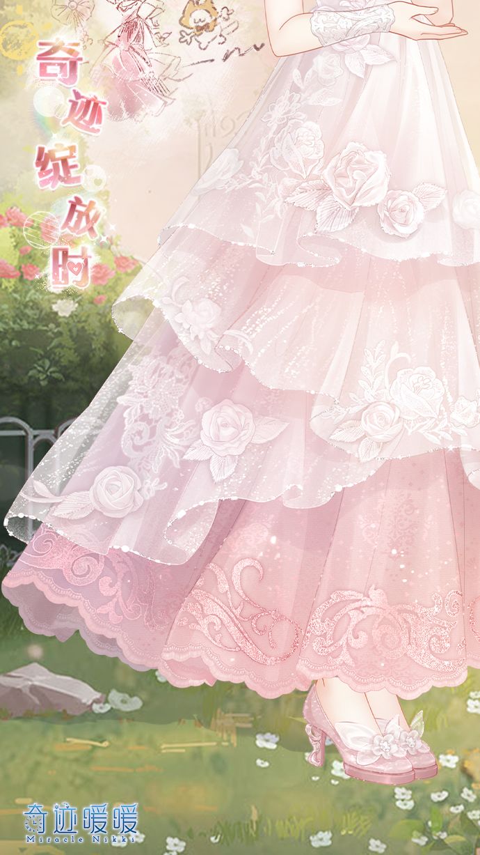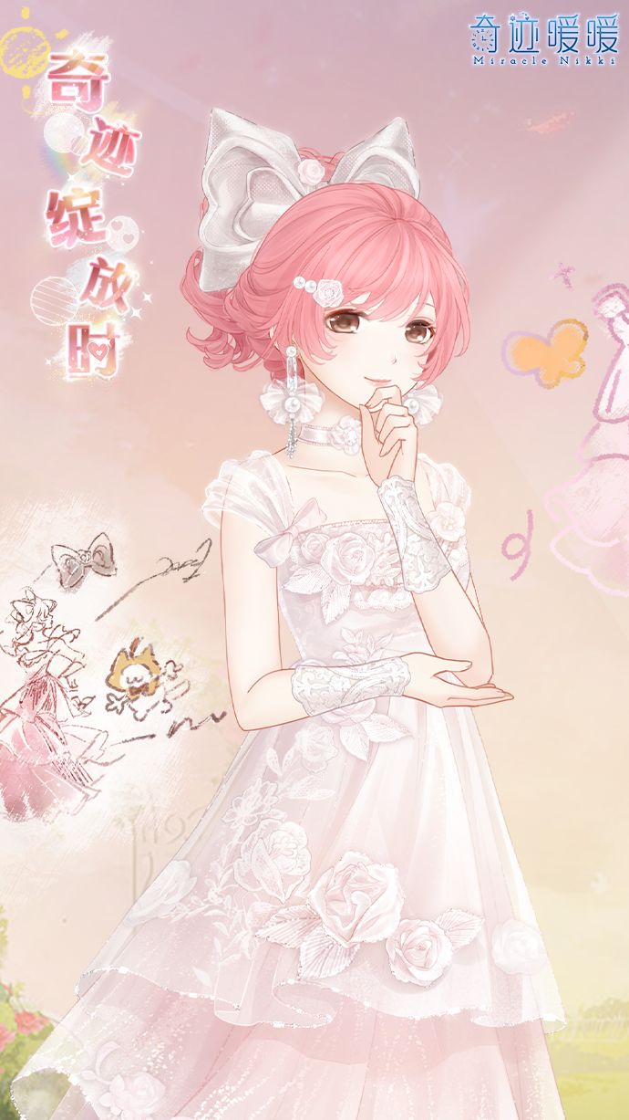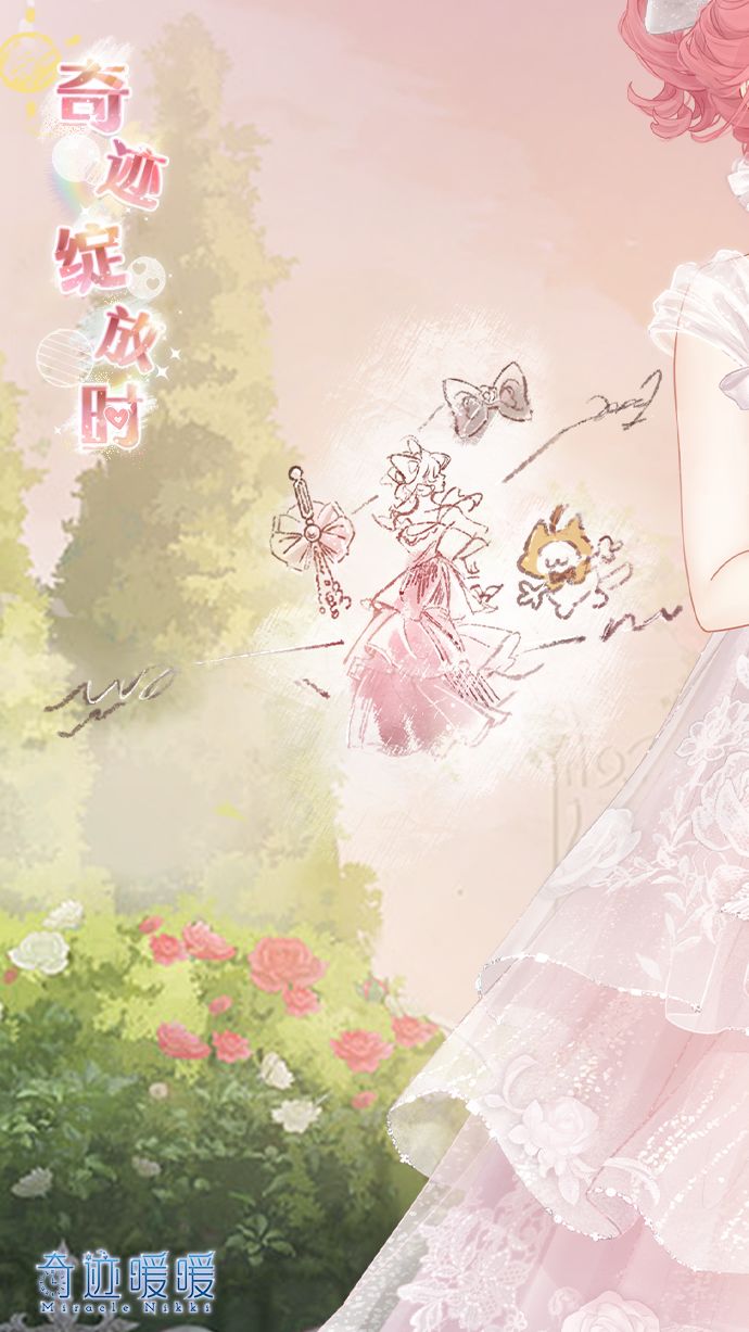 【奇迹绽放时】含正常姿势与特殊姿势,全新动态妆容“韶光之约”,动态连衣裙“奇迹绽放时”,特殊姿势手套“绮想蔷薇”,特殊姿势鞋子“薰风溯时”,动态摆件“梦愿时刻”、“联翩期许”,动态发型“芬芳晨雾”,动态发饰“芳馨密语”。