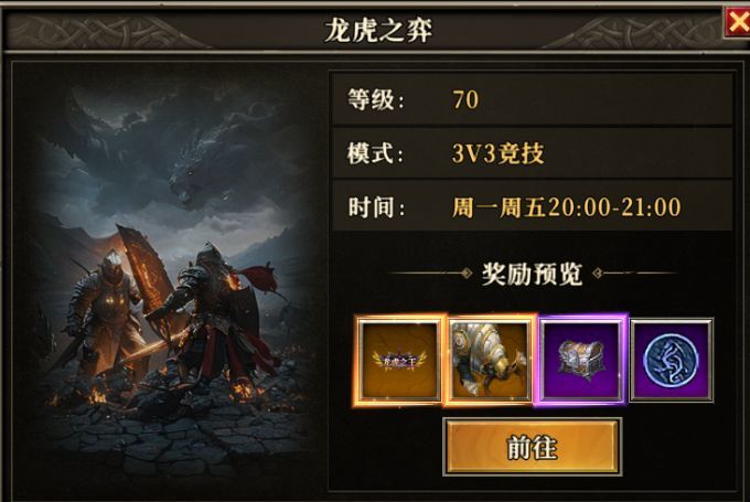 龙虎之奕是一种3v3对战的玩法,周一和周五的晚上八点开始,持续一个小时,这期间可以无限次数匹配。玩家可以自由组队3人进行匹配对战,也可以自动匹配三人进行对战,如果有朋友一起玩的话,这边推荐一个组合,一个巫师,一个祭祀。一个战士,这是最佳的搭配组合,巫师负责击杀伤害,祭祀可以攻击,可以给予队伍辅助加血,战士则是负责抗住对面的伤害,相当于肉盾,这样的话,不管对面是什么组合,都能够和对面碰一碰。