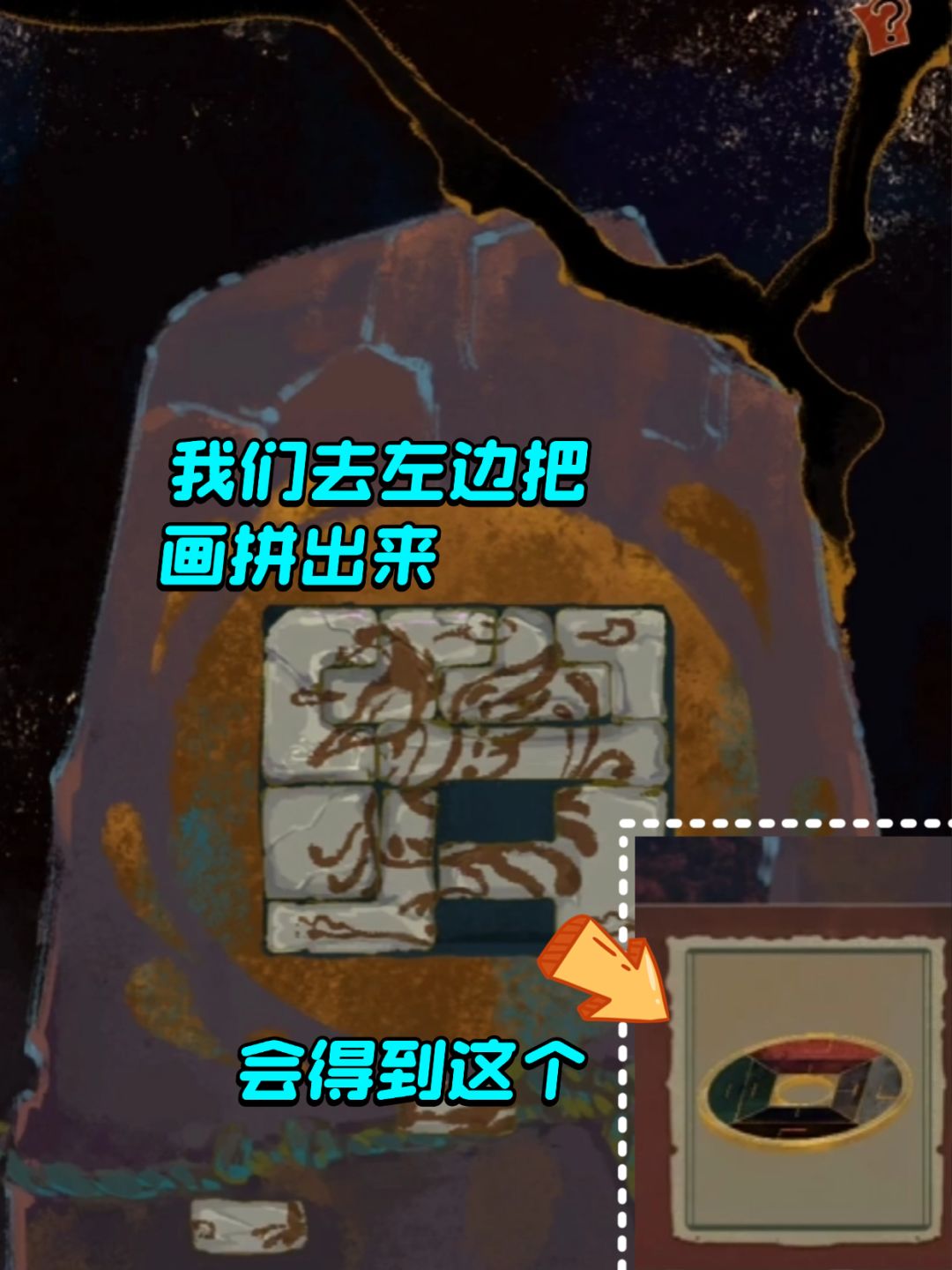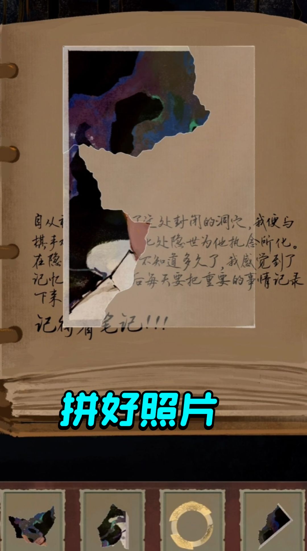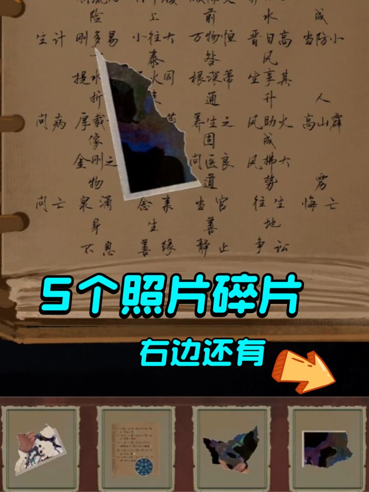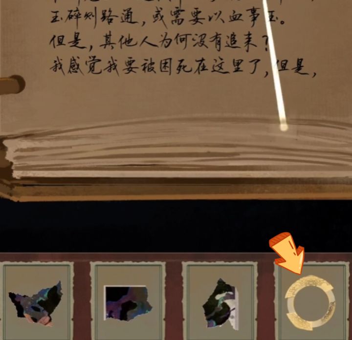先点书包里的笔记本,慢慢翻页有5个照片碎片,还有一个金属环,点上去其实就是蚩尤环,拼好照片碎片会得到衣服拼图的画,去左边的场景把画给拼出来能得到一个纹玉盘(像钱币一样的)还需要两个,这个时候往右边走进洞,有一个发光的东西,叫玉什么,你点击他就会出现线索