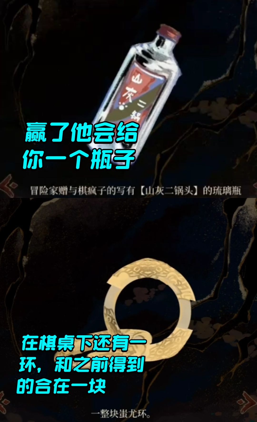 赢了可以得到一个瓶子,在棋桌下面还可以得到另一个蚩尤环,这个和前面那个是可以连在一块的组装在一起