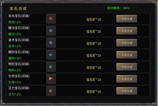 特别注意所有合成都只有百分之40的成功几率。请量力而行,以免合到最后一场空。建议有大量屯了大量宝石矿再去进行高级的合成。