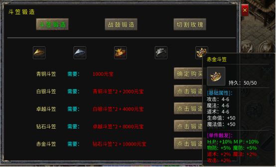 斗笠锻造:青铜-白银-卓越-钻石-赤金-龙鳞-荣耀-传承-共工;每提升一级不仅有基础属性的加成,更有单件HP、MP、物防、魔防百分比加成;