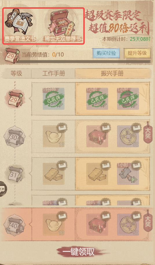 县令手册售价68元,是所有氪金项目中性价比最高的选择。它不仅提供额外一个建造队,还能获得大量高级强化石、金砖和丝线等稀缺资源。手册满级后还赠送自选僚属箱子。
