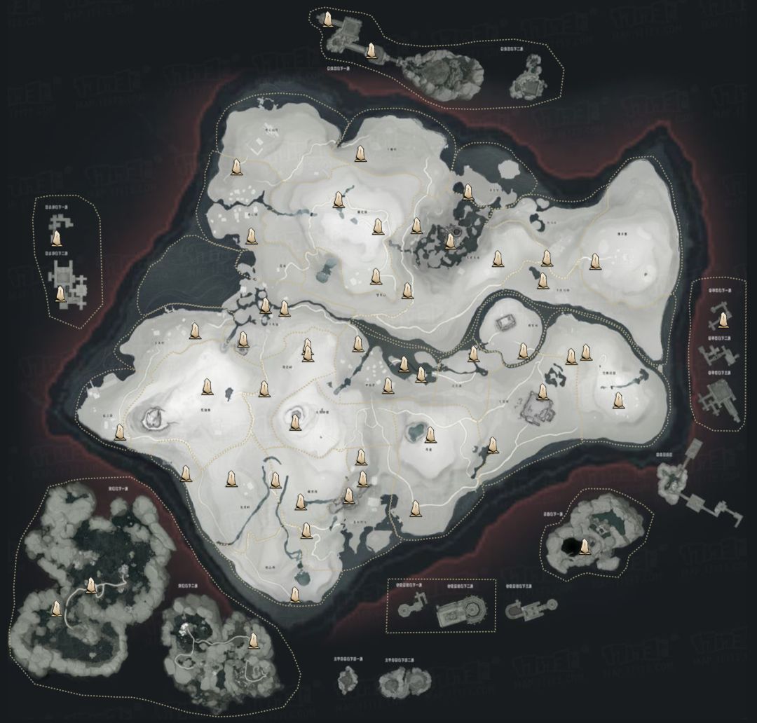 首先就是界碑,没点亮之前是灰色的,点亮之后黄色状态,到达后,建议大家第一时间将其点亮,可以节省我们大量跑图时间。也有些地上找不到的界碑,那就是藏在地下的,跟着剧情走就能找到,下面是全地图界碑所在地。