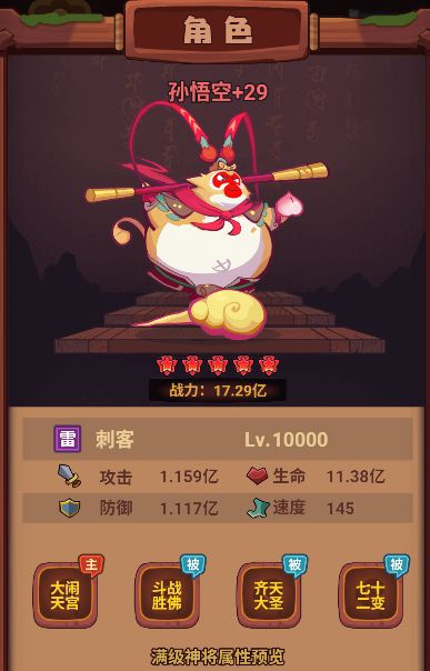 孙悟空因为高额的一个群体攻击手段,一直都是新手玩家在开服前期的推图首选,首先它的技能基础技能就已经可以对敌方全体造成攻击力450%的伤害,并且因为被动斗战胜佛每回合增加攻击力以及七十二变的雷罚效果存在,在后续的回合数被动堆起来后即使在PK面对那些防御高或者是回血多的阵容也可以做到秒杀敌方。但是因为自身技能并不具备回血以及减伤的效果。所以会比较怕遇到对方比自己速度快先秒了自己的情况。