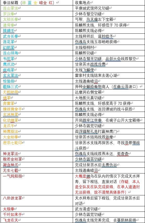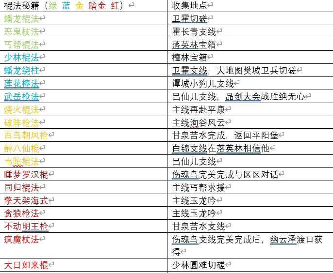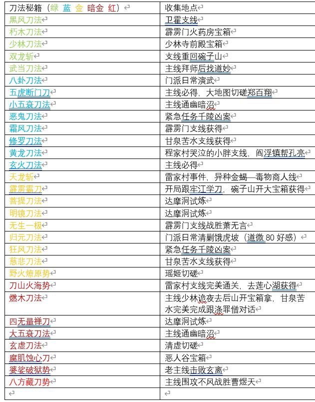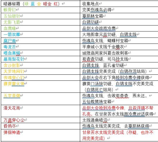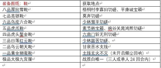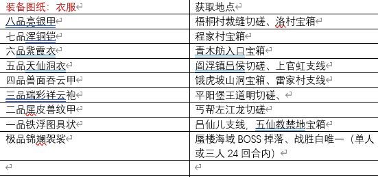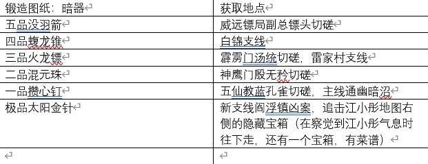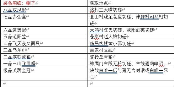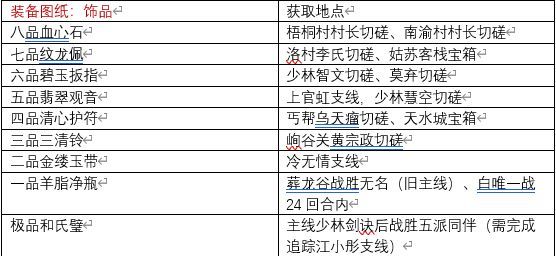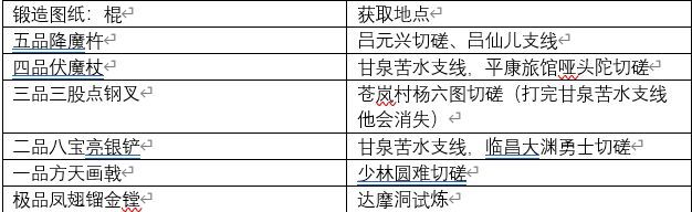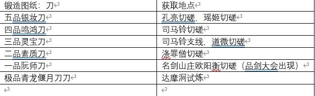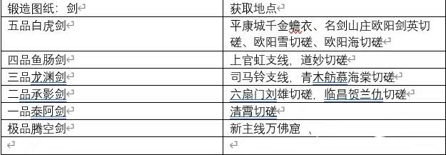 武器图纸(九到六品之间的武器可以在名剑山庄处购买,故不赘述)