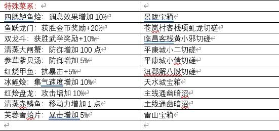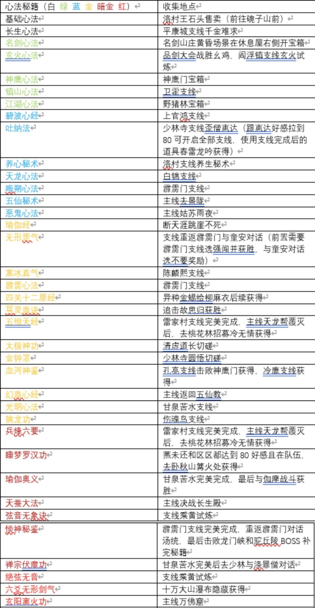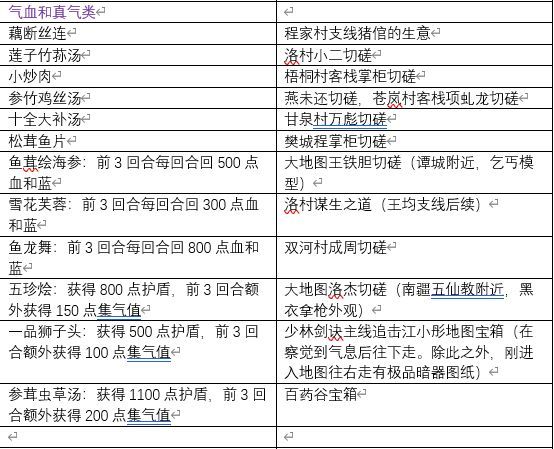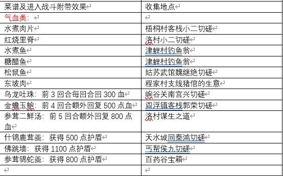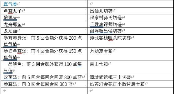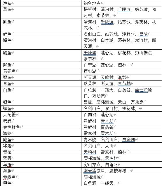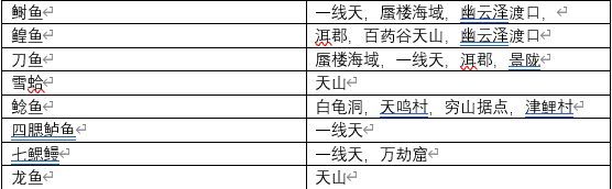 『秘籍』『防具/武器图纸』『丹方』『菜谱』『鱼获』共6种需要收集的物品的位置。