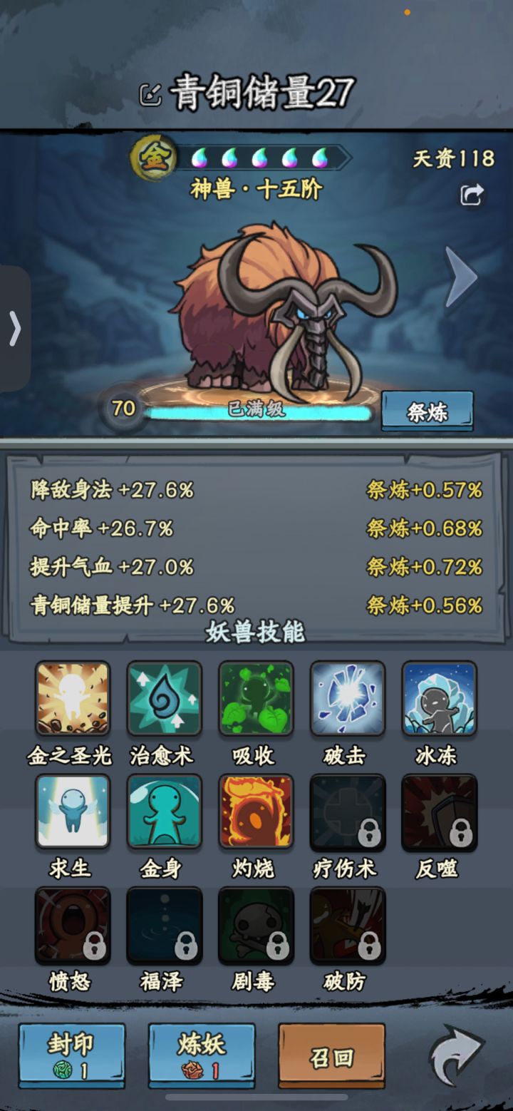 宠物的属性必须有一条加命中,技能破击 求生 吸收必备,想低战力压线过必须带一个金身,最好加两个回复技能。攻击大概9.5万左右➕大克➕天象➕满丹药可以尝试击杀。