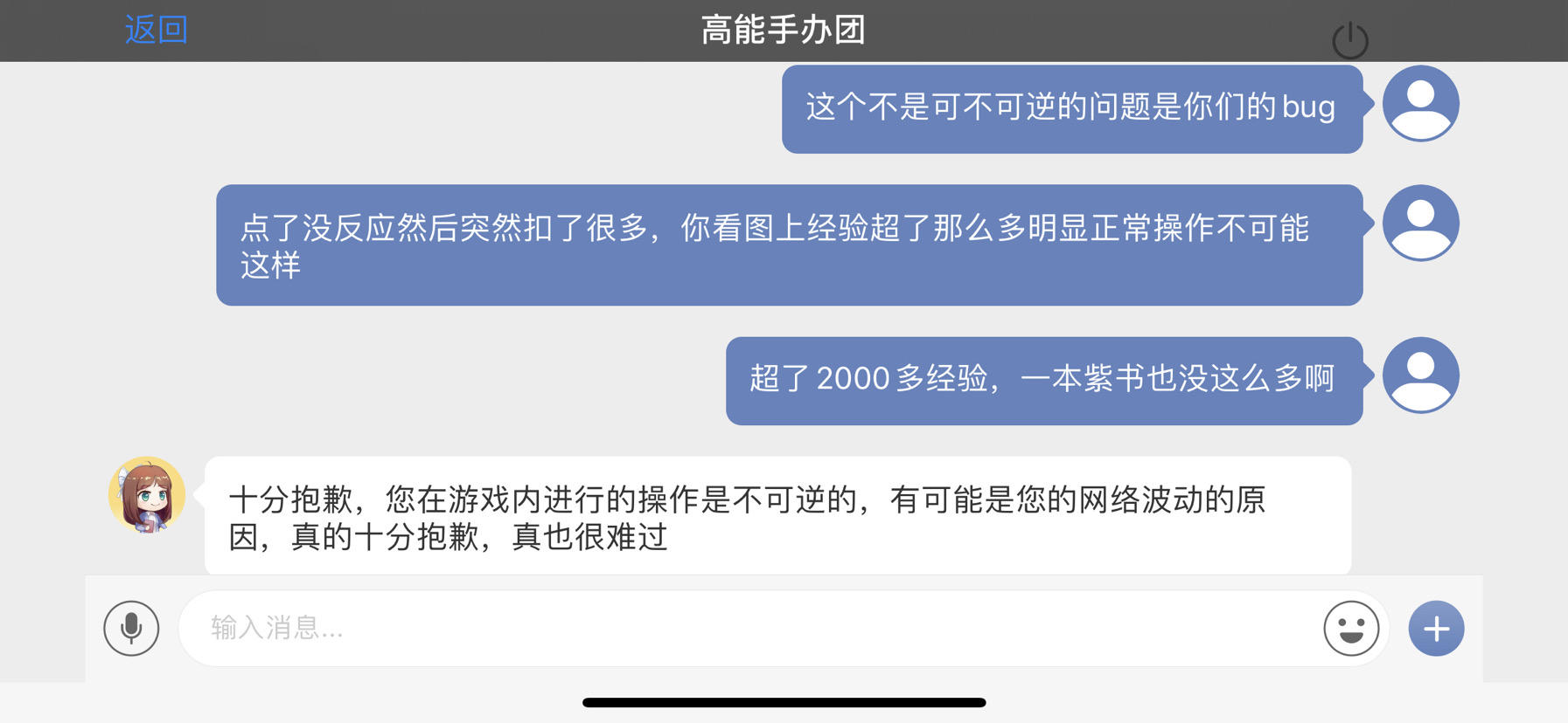 升级的时候吃紫书,点了半天没反应就多点了几下,结果等了一会突然扣了很多,一本紫紫书就500经验,正常操作怎么可能一下超2000多经验,明显是bug,完全可以server增加鉴定是否达到经验上限的逻辑或者客户端网络不好的时候做错误处理规避,这问题太低级了。客服一直给我回游戏内操作不可逆的我真是醉了,补偿不给就算了也不打算反馈给开发修一下?发出来给大家避坑,点了没反应千万别点了