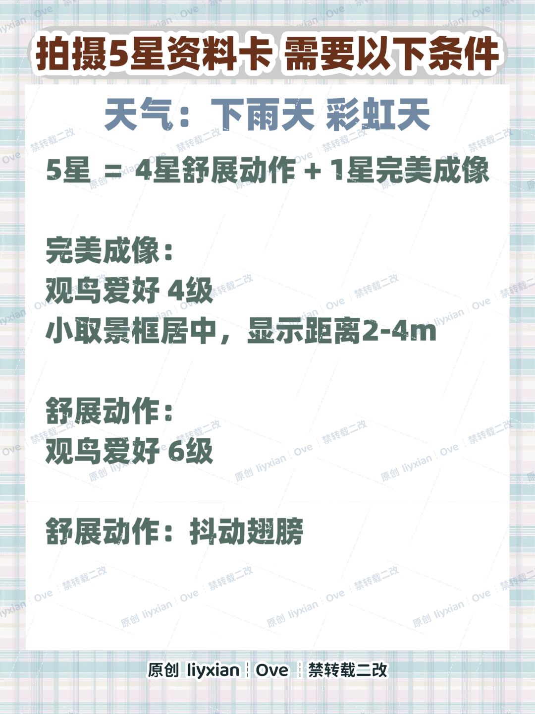 ② 下雨天,可以拍摄5星鸟类资料卡: