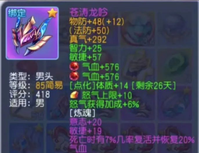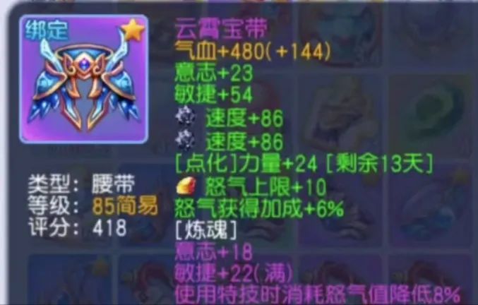 炼魂:炼魂属性意志18 + 敏捷18,虽为紫色但仍有提升空间,特效御兽可增强宠物输出,整体表现尚可。