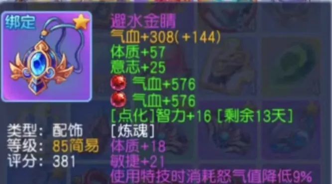 基础属性:配饰气血 +308,距离90级配饰上限310仅差2点,表现非常优秀。