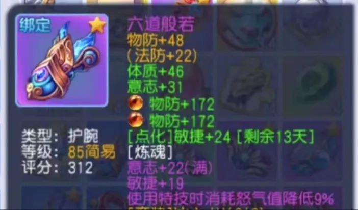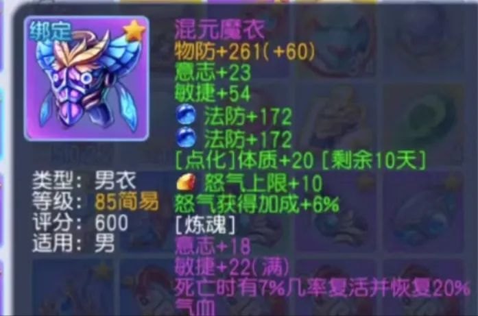 点化:点化属性为体质、力量、智力随机,力量 +24对大佬来说不太实用,后期改体质会更完美。炼魂:炼魂属性意志18 + 敏捷22,非常出色,封印职业看了都会羡慕。特效为愤怒降低8%,整体表现很强。