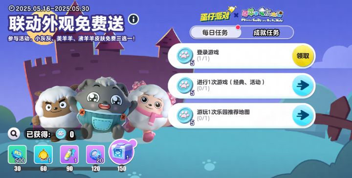 Step2:5月16日0点-5月30日,每日完成简单任务获取羊狼币,当羊狼币数量累计达到指定数量,即可免费领取萌趣动作<委屈>、“联动外观三选一宝箱”等福利!