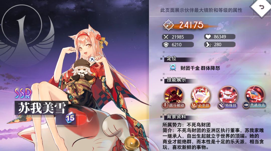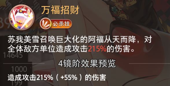 苏我美雪召唤巨大化的阿福从天而降,对全体敌方单位造成攻击215%的伤害。