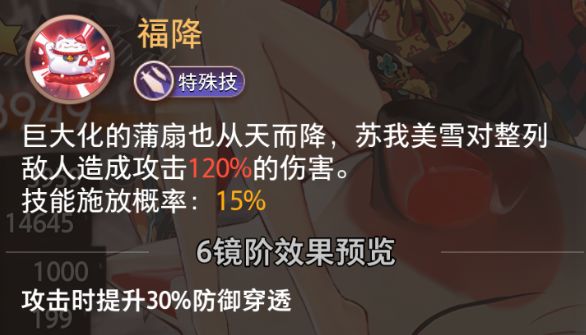 巨大化的蒲扇也从天而降,苏我美雪对整列敌人造成攻击120%的伤害。