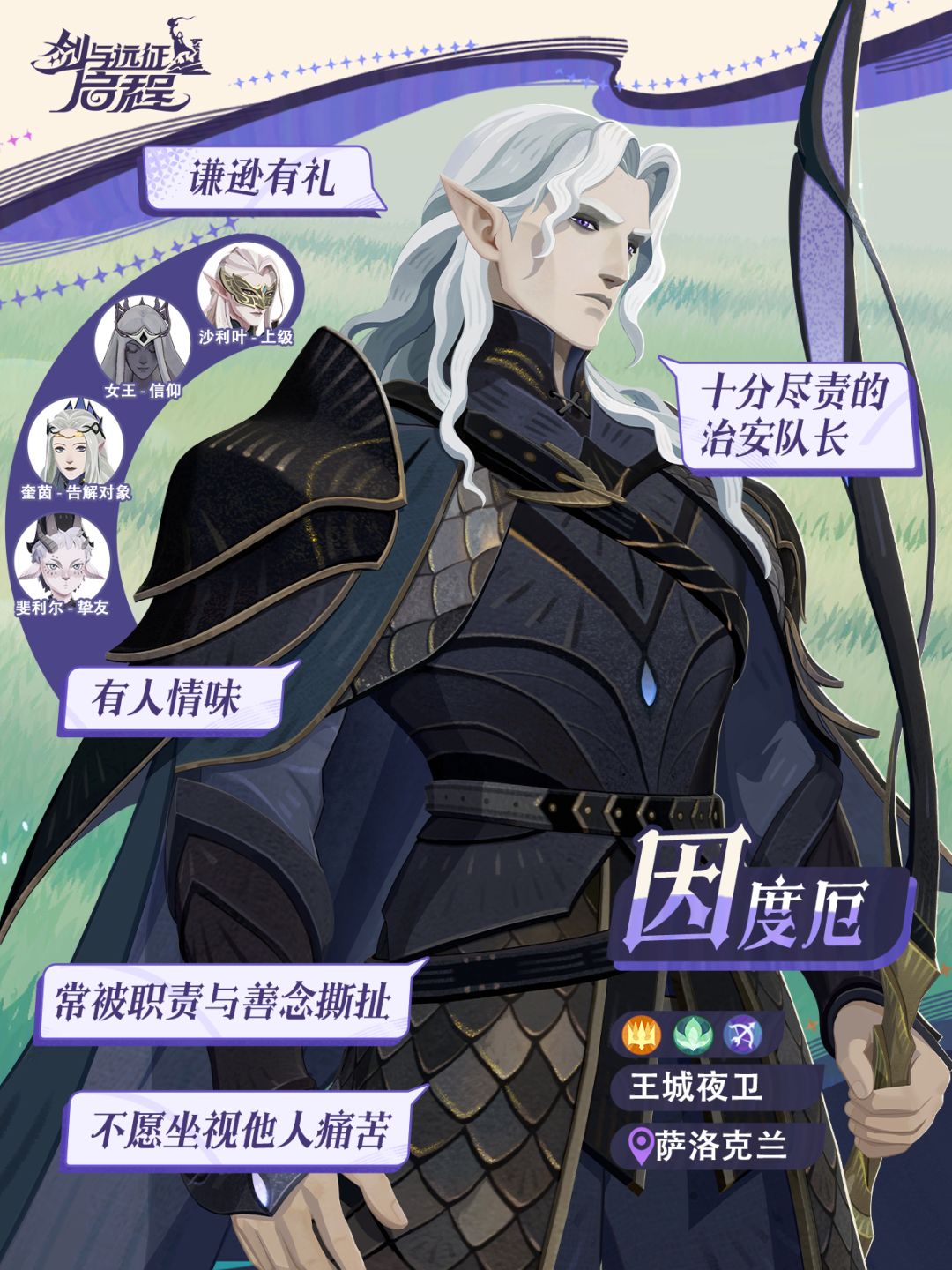 因度厄是萨洛克兰历史上第一位加入王城卫队的平民,出众的资质与相貌弥补了他不解风情的性格。