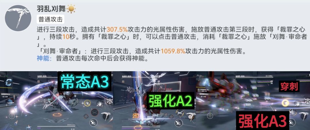 - 常态A3下+强化A2下解禁1「幽刃·轮破」3s 即aaa(获得裁罪之心)+aa11