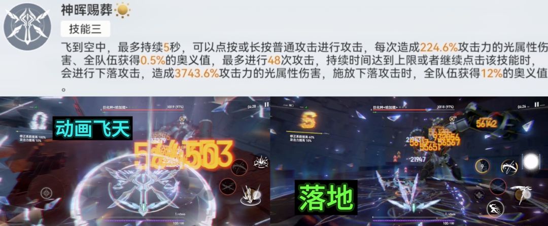 - 空中阶段:角色腾空至多5秒,期间可点/长按普攻造成光伤,每次攻击为全队回复0.5%奥义值,最多触发48次