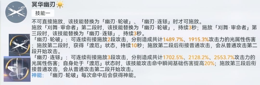 - 常态未满神能造成光伤,命中后获得神能。